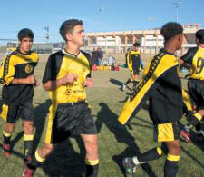 Two soccer teams join for a photo in